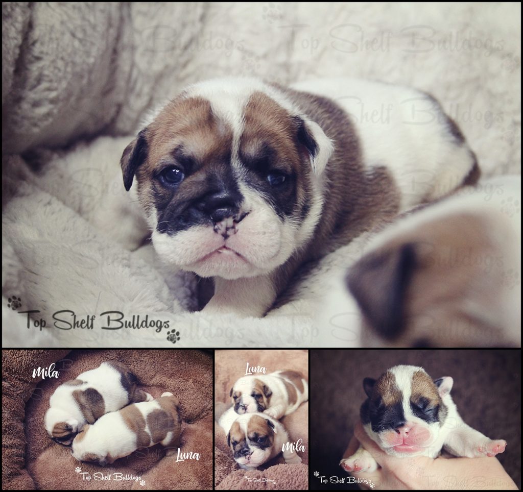Mila – SOLD SOLD to Becky in Tampa, FL – AKC English Bulldog Puppy – Mila – $2495 Zoey/Niklaus Litter born August 22, 2018 Zoey/Niklaus FEMALES: Luna (left) Mila (right) ******************************************************